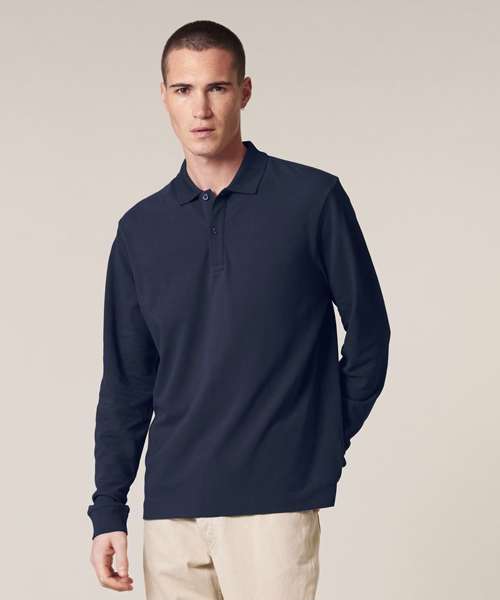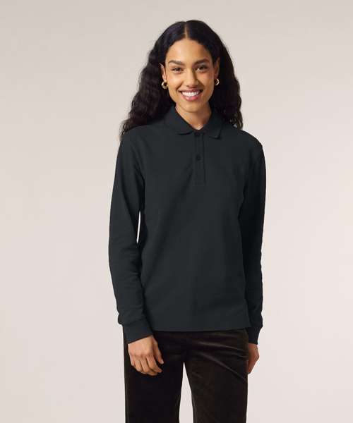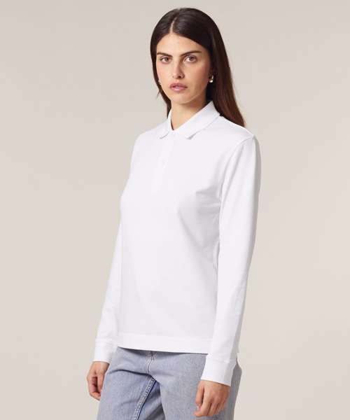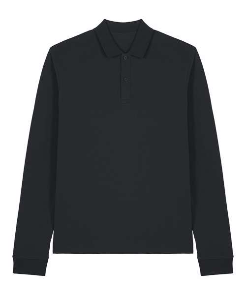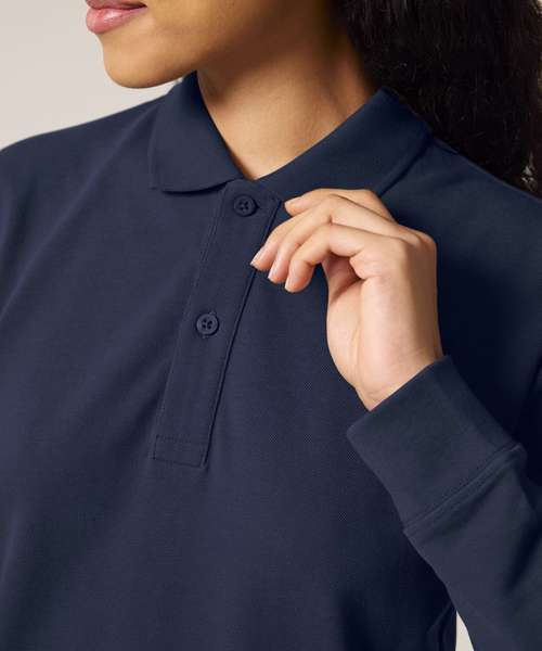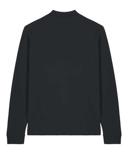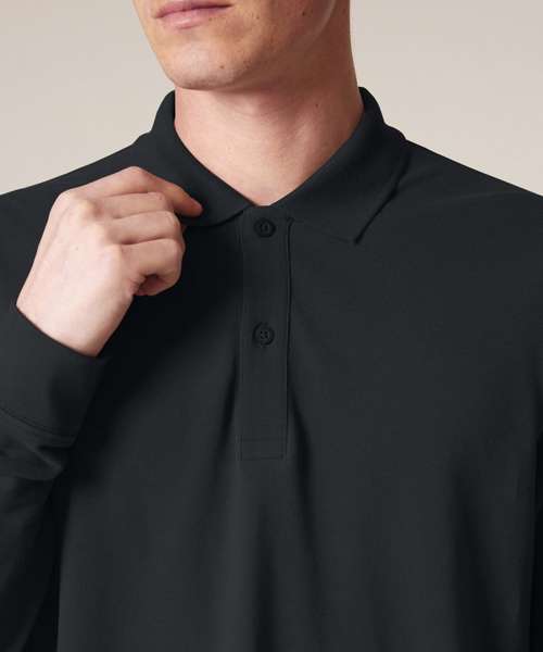 Set-in sleeve. Flat knit rib on the collar. Inside heavy single Jersey back neck tape. Front placket with two buttons in matching body colour. Slit at side seams with heavy single Jersey facing. Single-needle topstitch at shoulder seams. 1x1 rib at sleeve hem. Bottom hem with a narrow double-needle topstitch.