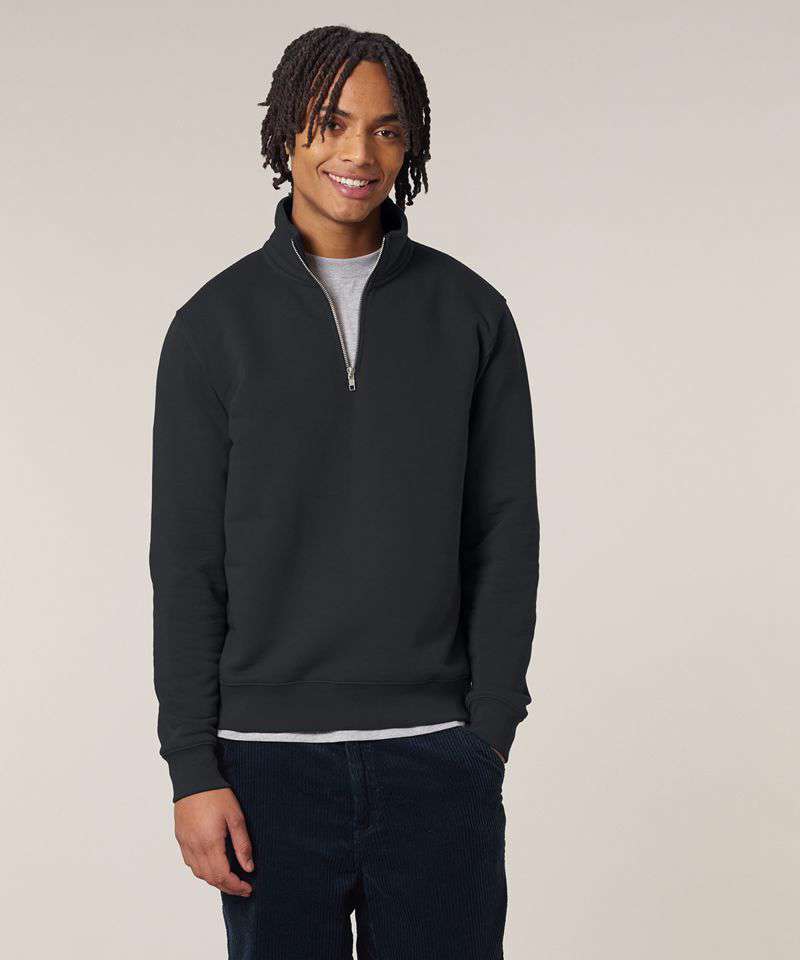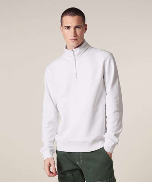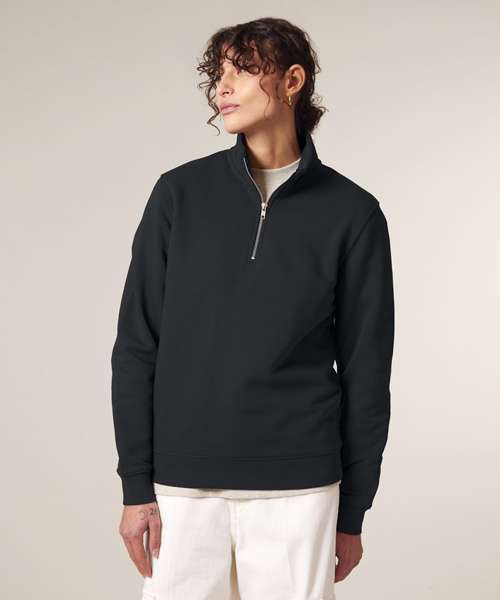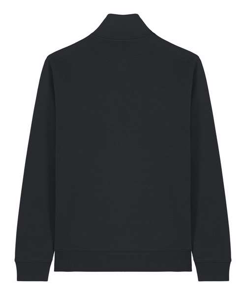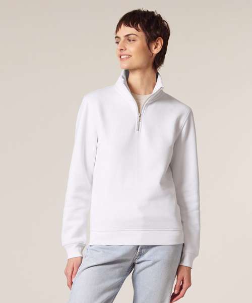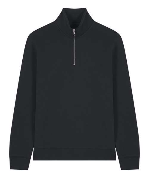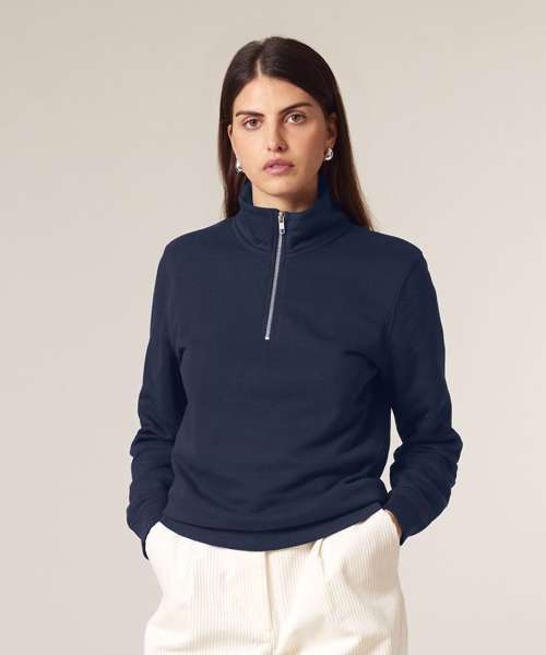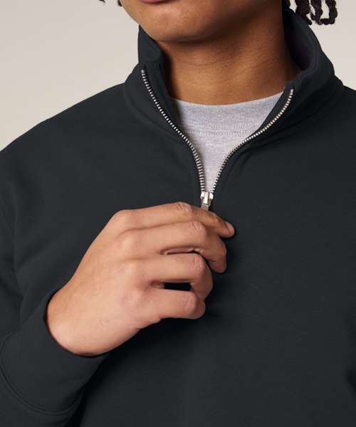 Set-in sleeves. Self-fabric mock neck collar. Quarter-zip at the centre front. 1x1 rib at sleeve cuffs and bottom hem. Double-needle topstitches at the armhole, sleeve cuffs and bottom hem. Herringbone tape at the inside back neck and the inside of the zip. Self-fabric half moon at back neck.