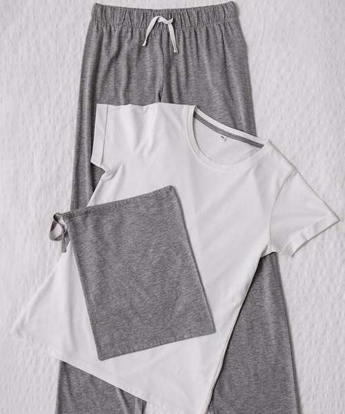 Women's long pant pyjama set with a white t-shirt with roll up sleeve detail and a looser crew neck. Contrast long pants with an elasticated and draw cord waist. Soft single jersey perfect for decoration. Keep away from fire.