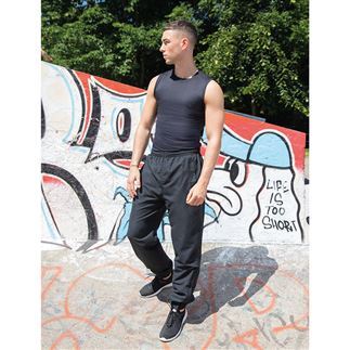 Quick dry microfibre with peached finish. Elasticated waist and drawcord, front pockets right with zip as worn. Elasticated leg openings, side leg zips at hem, back pocket with hook and loop fastenings, fully mesh lined. Zip across for decoration.