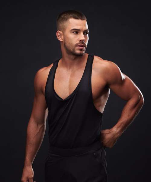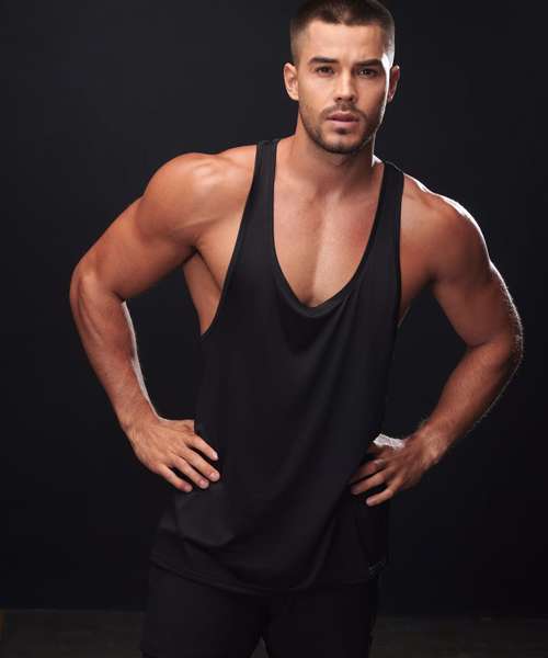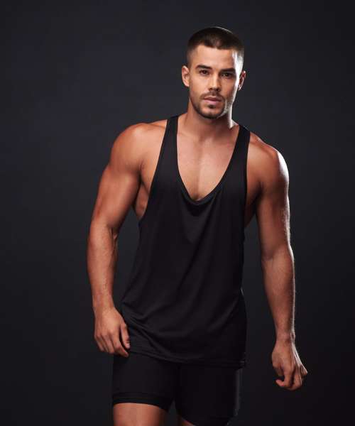 Shaped work out vest, lightweight soft hand feel fabric, self fabric binding, tear-out label.
