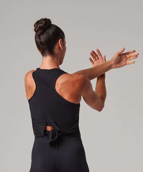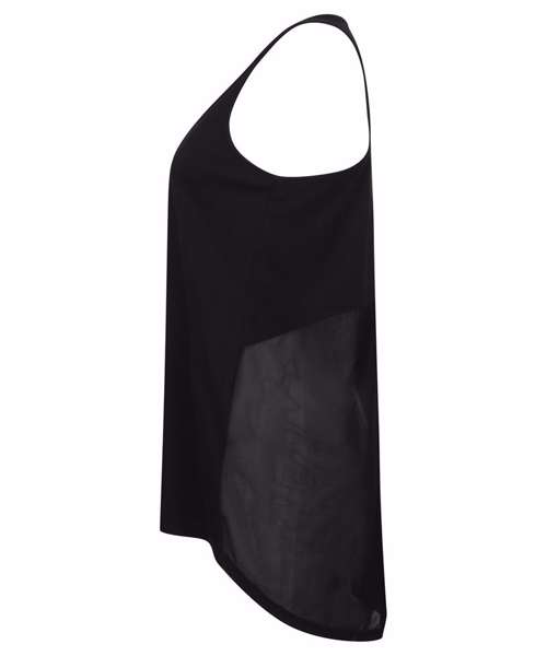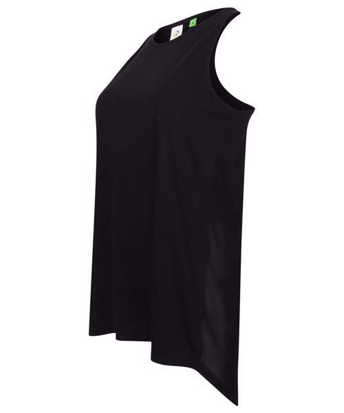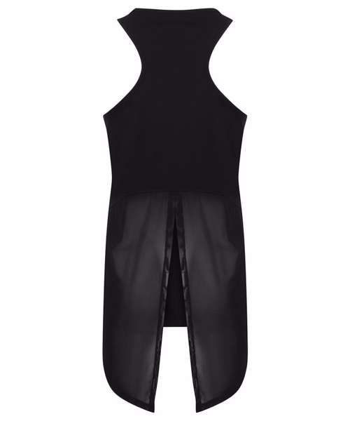 Soft-touch single Jersey fabric. Self-fabric binding at neck and armholes. Wide racer back with forward facing shoulder seams. Long back with split up the middle, which can be worn open or tied up. Curved back section where split begins. Tombo tear-out label.