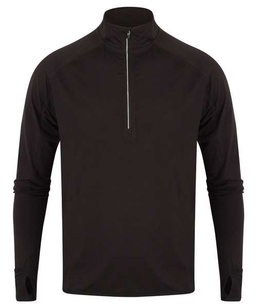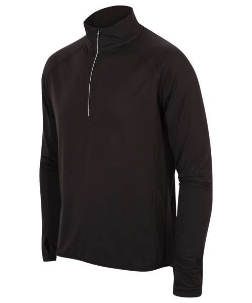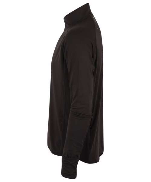 ¼ zip Jersey top with wicking finish. Long sleeves with thumbhole and fold over cuffs. Elasticated binding on cuffs and hem. Raglan shoulder seams with flatlock stitching and reflective dots detail on back of garment. 1/4 length zip with reflective trim and semi-automatic lock zip slider. Stand up self-fabric collar. Side panels. Key pocket on left back panel seam with concealed zip and inner headphone access hole. Tombo tear-out label.