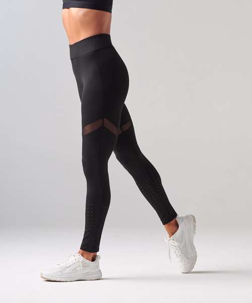 Opaque, stretch fabric. Deep waistband with inner pocket. Squat-proof. Fine mesh panels on front and back thigh. Laser cut panels at lower calves, front and back. Tombo tear-out label.