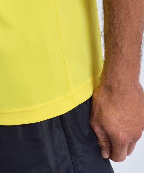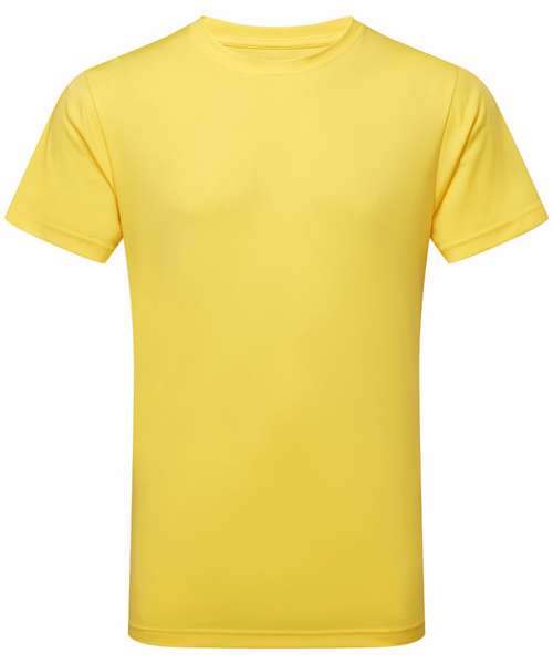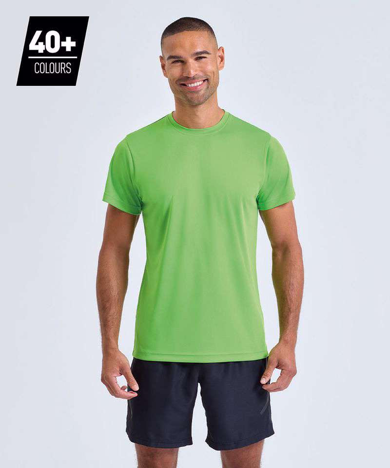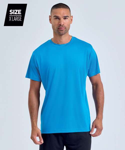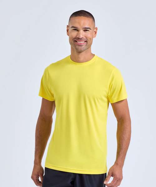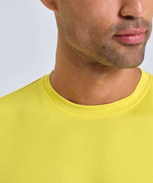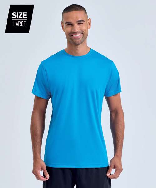 Wicking fabric. Stretch. Crew neck. Short sleeve. Lightweight. Twin-needle stitching on hem and arms. We recommend using block out vinyl and inks.Product contains no branded neck or waist label. Removable Kimble or looped garment tags. Inner seam label holds important product information on one label with a second label containing brand information which can be cut-away. UPF 40+.