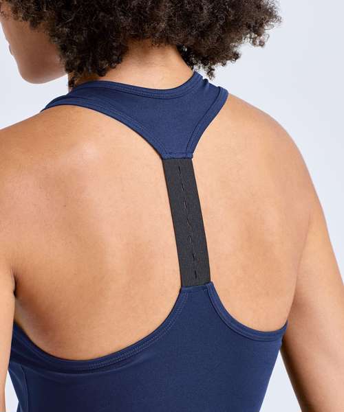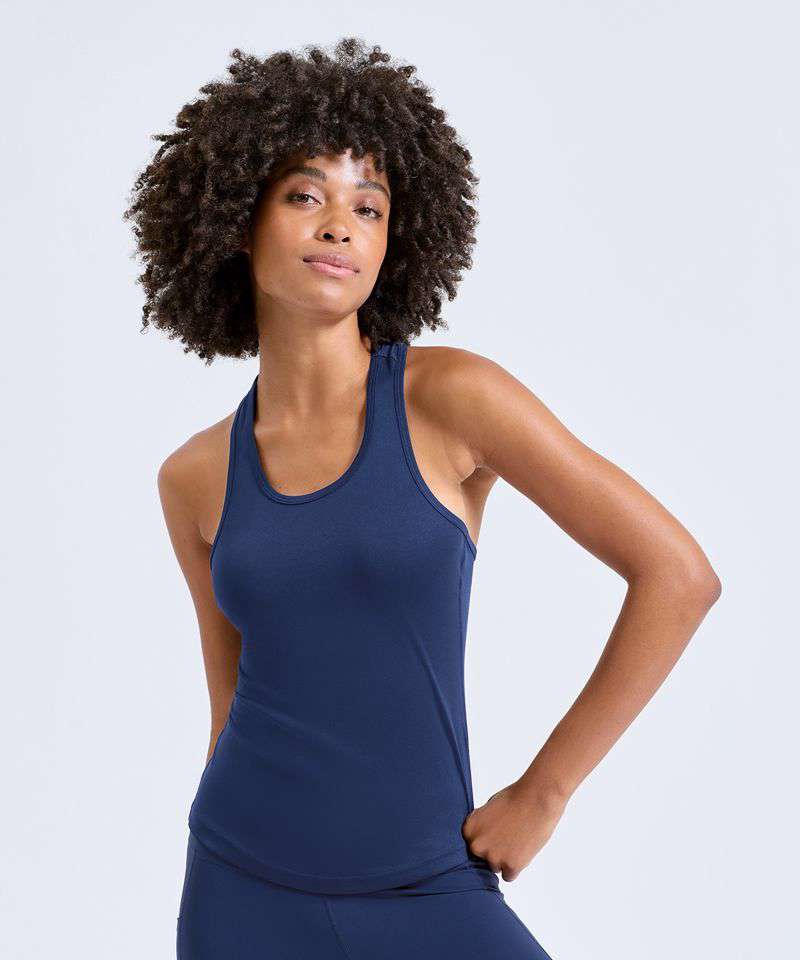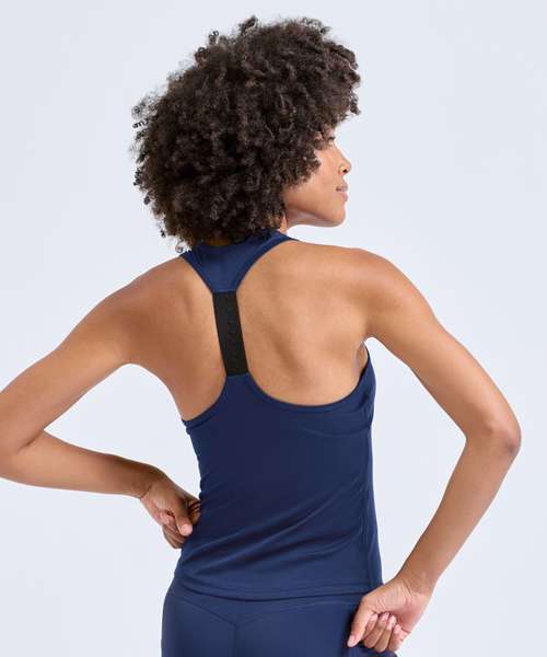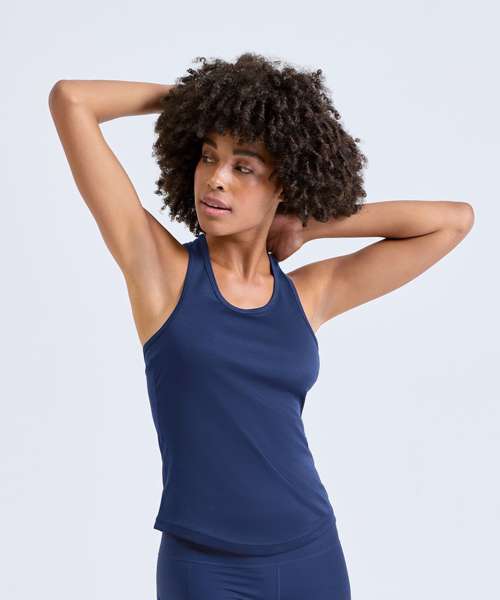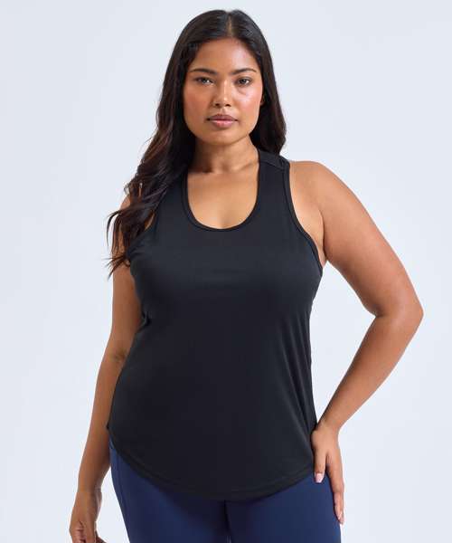 Scoop neck. Elastic racer back with 'laser cut' holes. We recommend using block out vinyl and inks.Product contains no branded neck or waist label. Removable Kimble or looped garment tags. Inner seam label holds important product information on one label with a second label containing brand information which can be cut-away.