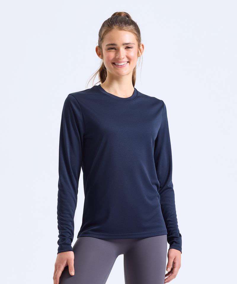 Wicking fabric. Stretch. Crew neck. Long sleeve. Lightweight. Twin-needle stitching on hem and arms. Mesh back. We recommend using block out vinyl and inks.Product contains no branded neck or waist label. Removable Kimble or looped garment tags. Inner seam label holds important product information on one label with a second label containing brand information which can be cut-away. UPF 40+.