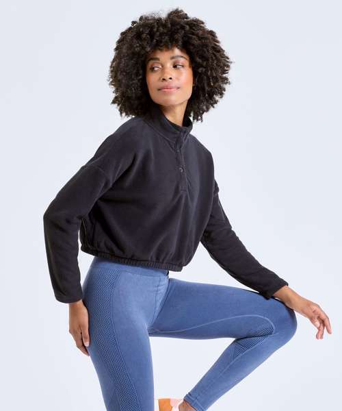Cropped pull-over fleece with high neck. 1/4 neck popper fastenings to front. Elasticated waistband. We recommend using block out vinyl and inks.Product contains no branded neck or waist label. Removable Kimble or looped garment tags. Inner seam label holds important product information on one label with a second label containing brand information which can be cut-away.