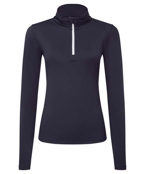 ¼ zip design. Long sleeves. Stretch. Recycled polyester. Wicking fabric. Brushed inner. The product contains no branded neck or waist label. Removable kimble or looped garment tags. The inner seam label holds important product information on one label with a second label containing brand information which can be cut-away. We recommend using block out vinyl and inks.