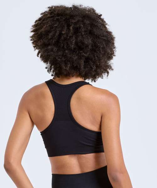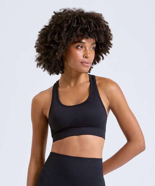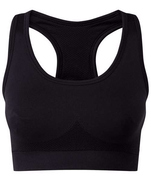 Seamless sports bra. Grown-on waistband. Body sculpting design detailing. Medium impact. We recommend using block out vinyl and inks.Product contains no branded neck or waist label. Removable Kimble or looped garment tags. Inner seam label holds important product information on one label with a second label containing brand information which can be cut-away.
