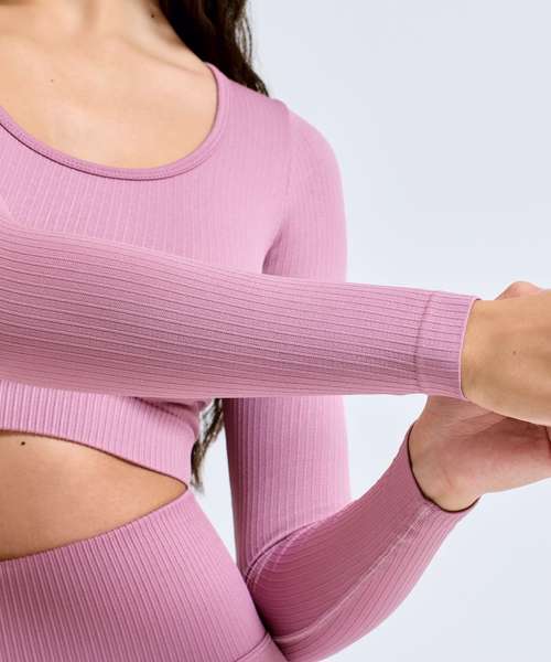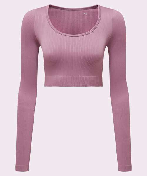 Seamless. Cropped, long sleeve top. Deep crew neck. Double-layered under bust for extra support. Ribbed detailing. We recommend using block out vinyl and inks.Product contains no branded neck or waist label. Removable Kimble or looped garment tags. Inner seam label holds important product information on one label with a second label containing brand information which can be cut-away.