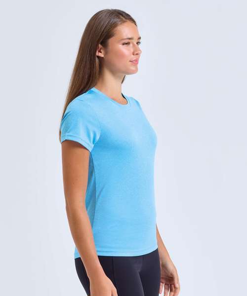 Wicking fabric. Stretch. Crew neck. Short sleeve. Lightweight. Twin-needle stitching on hem and arms. Recycled polyester. We recommend using block out vinyl and inks.Product contains no branded neck or waist label. Removable Kimble or looped garment tags. Inner seam label holds important product information on one label with a second label containing brand information which can be cut-away. UPF 40+.