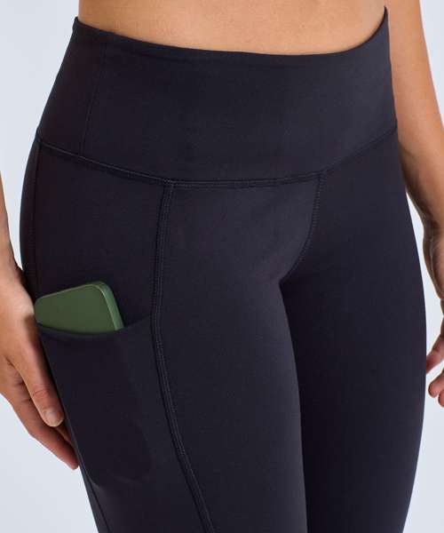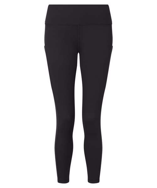 7/8 length leggings (1/8 shorter than full-length). Soft stretch. Recycled fabric. Elasticated self-fabric waistband. Two pockets to each leg. The product contains no branded neck or waist label. Removable kimble or looped garment tags. The inner seam label holds important product information on one label with a second label containing brand information which can be cut-away. We recommend using block out vinyl and inks.