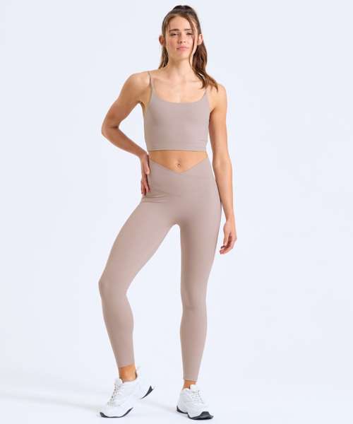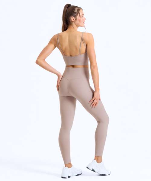 Certified recycled nylon. Stretch. Smooth finish. Medium impact. Hidden sports bra inner with removable bra pads for additional support. Double-layer back strap detail.