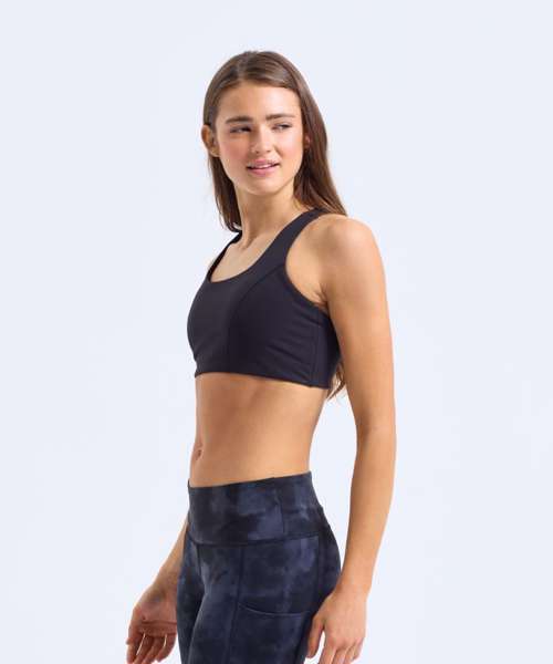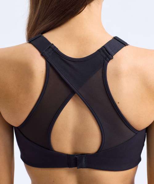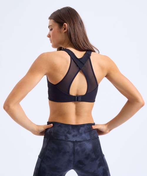 High impact. Certified recycled polyester. Stretch fabric. Mesh crossover back detail. Bust seam shaping. Adjustable straps. Adjustable bra clasp fastening to the back. Double-layer fabric for additional support. Removable bra pads.