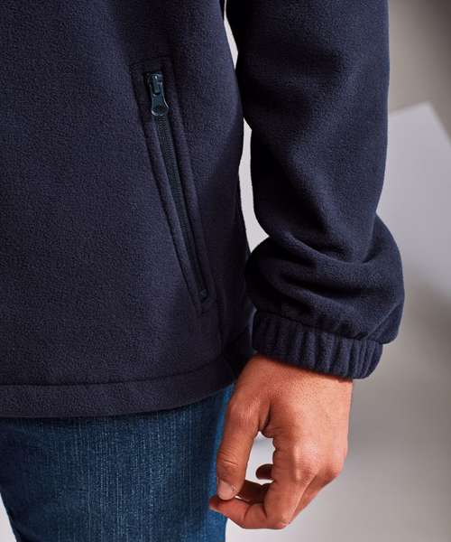 Warm and comfortable fleece jacket. Shaped to fit. Full zip front with cadet collar. Two zipped closed front pockets. Two interior pockets. Adjustable base drawcord. Easy relabel system. Product contains no branded neck label.* Removable Kimble or looped garment tags. Inner seam label holds important product information on one label with a second label containing brand information which can be cut-away.