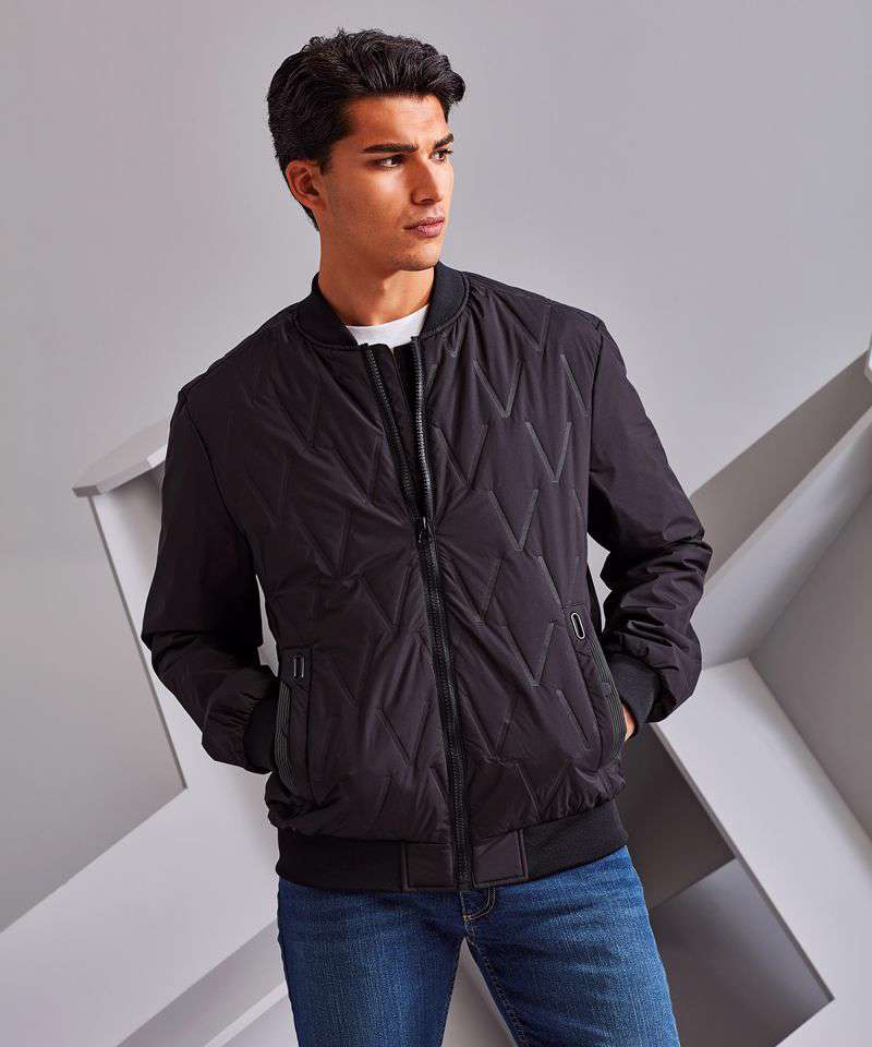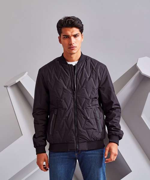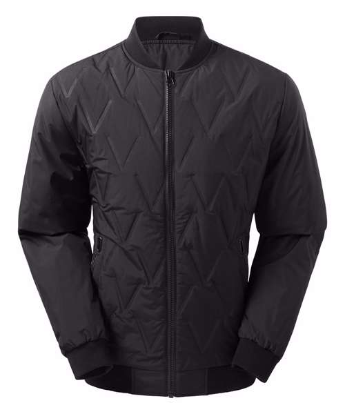 Tonal fashion coil zip on centre front with signature zip puller. Front & Back panels to be insulated with moulded vector shaped pattern. Insulated plain sleeves. 100gsm lightweight polyester fill. Fully-lined in tonal polyester. Bomber style collar. Welt pockets with rubberised stud opening, striped grosgrain trim with rectangular eyelet. Tonal elasticated cuffs and hem. Internal double jet zipped pocket. Internal zipped opening for embroidery access. Product contains no branded neck label.* Removable Kimble or looped garment tags. Inner seam label holds important product information on one label with a second label containing brand information which can be cut-away.