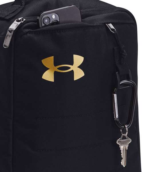 Water-repellent UA Storm technology keeps your stuff dry. Durable PU-coated material. Fits pair of shoes up to a size 14, with zip around opening for easy access. Front zip pocket. D-ring attachment point.